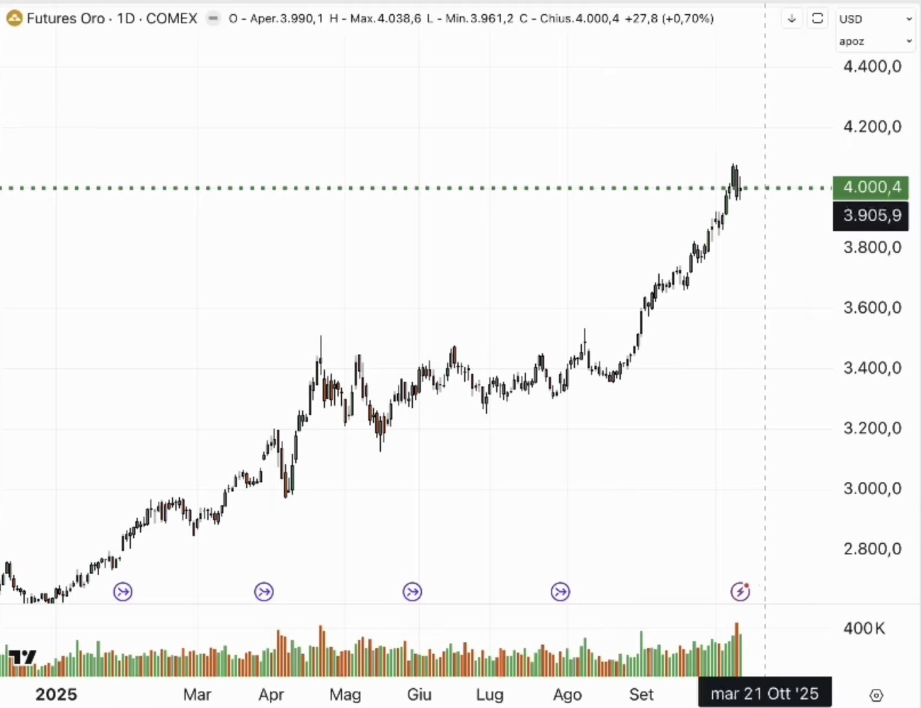 Ma anche le quotazioni dell’oro (si legga il grafico qui riportato), giunto alla sogli psicologica di 4000 Dollari, potrebbero ritrarsi leggermente qualora la sfiducia si propagasse sui mercati. Una sfiducia che non farebbe che aumentare le quotazioni dei titoli a reddito fisso, cioè che ne farebbe ulteriormente calare i rendimenti. Cioè esattamente quello di cui l’America ha bisogno!