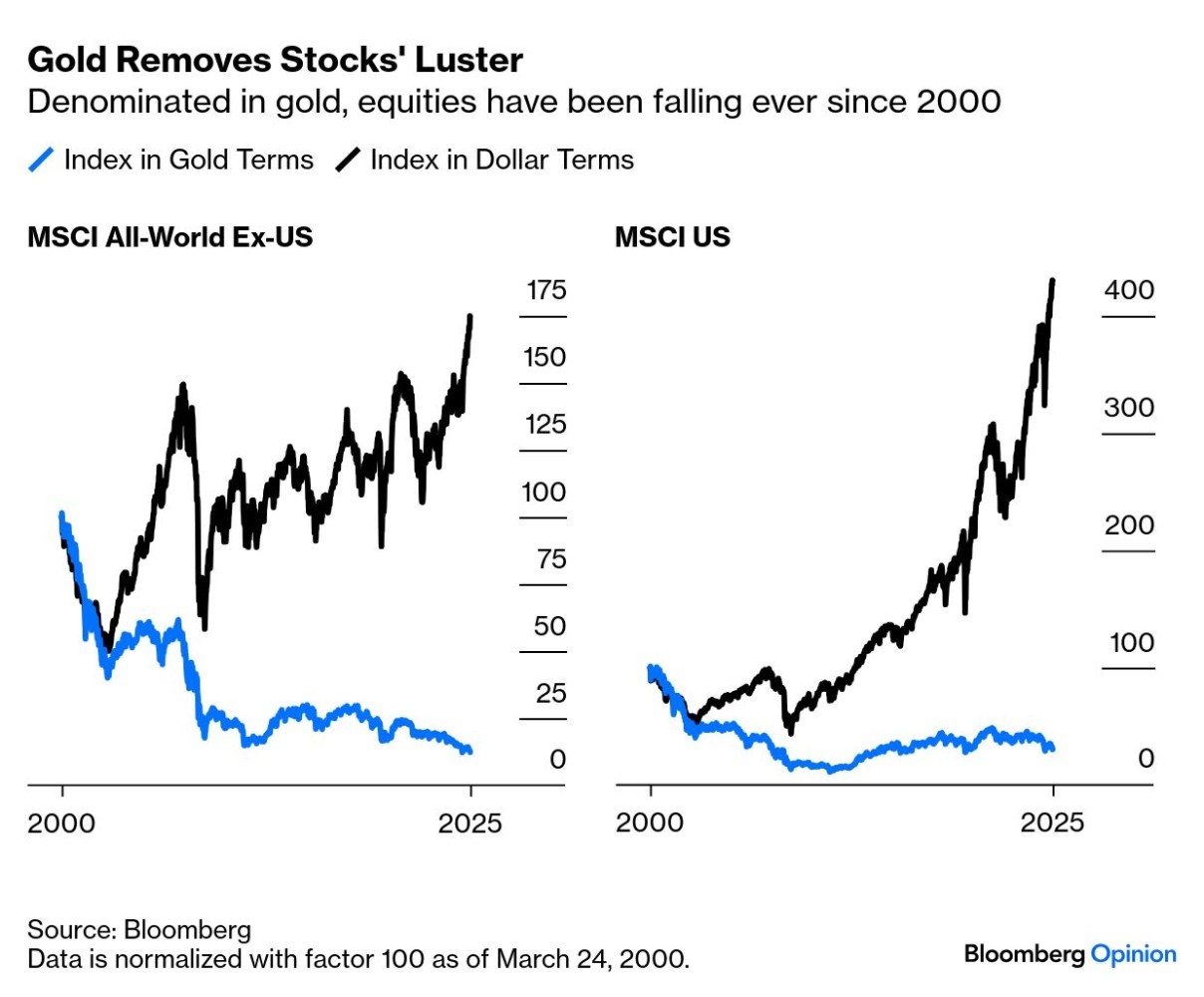 Dunque se Trump avesse la bacchetta magica (o la possibilità di influenzare i mercati) potrebbe aspettarsi di meglio? Difficile dirlo. Salvo il fatto che a giocare col fuoco (il prezzo dell’oro è incandescente) si rischia di bruciarsi le dita, quantomeno relativamente alle conseguenze indesiderate della svalutazione monetaria che segue inesorabilmente all’ascesa impareggiabile del metallo giallo. Ma qualcosa occorre pur rischiare, no? Ad esempio l’andamento recente delle borse, in termini aurei, non è stato poi così brillante, anzi! (si veda il grafico qui sotto). Dunque il problema è quello della brillantezza: più sale quella del metallo giallo più scende quella di tutto il resto:
