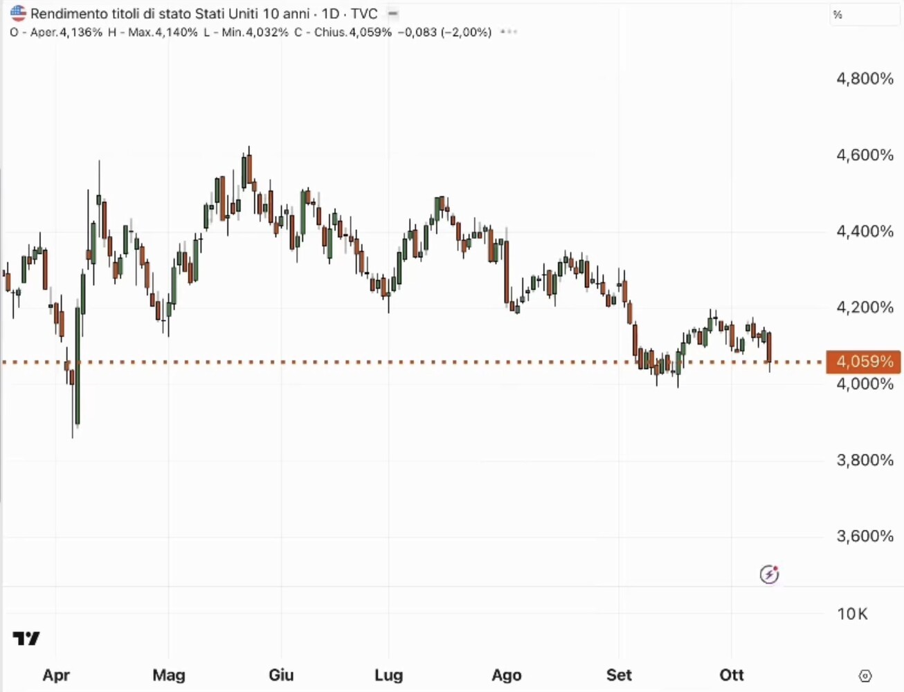 I risultati infatti per il momento l’amministrazione parrebbe averli a portata di tiro, dal momento che il calo improvviso dei mercati azionari ha avuto come effetto collaterale il calo dei rendimenti del titolo decennale americano, giunto alla soglia del 4%, come si può vedere dal grafico qui allegato: