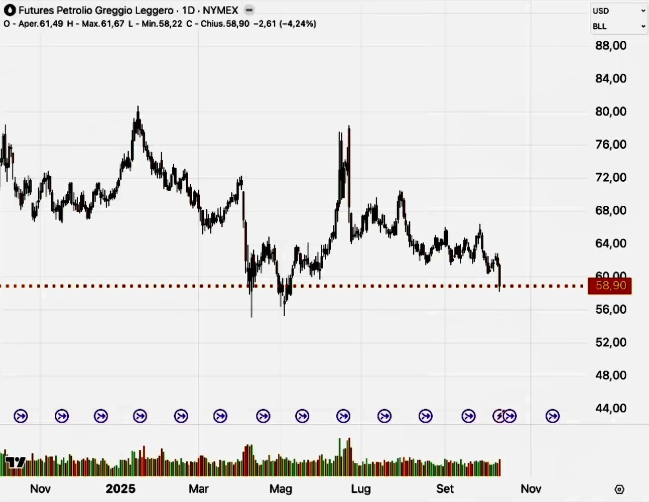 Anche il petrolio ha avuto una svolta al ribasso, toccando minimi che non si vedevano dalla scorsa primavera (come si vede dal grafico qui sotto) e evidentemente questa tendenza aiuta non poco a contenere il rischio inflazione dei prezzi.