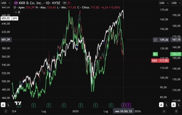Si guardi ad esempio il paragone dell’andamento dello SP500 (linea bianca qui sotto ) con l’andamento del principale titolo del Private Equity americano (KKR, linea verde) che aveva già iniziato da qualche tempo la sua discesa probabilmente a causa di qualche dubbio sull’abbondanza futura della liquidità dei mercati: