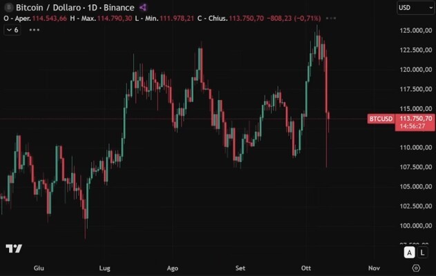 Oppure si guardi un andamento analogo sul fronte del Bitcoin, cioè la principale delle criptovalute (che sono scese tutte più o meno della stessa proporzione), tornato di colpo sotto al livello di fine Agosto: