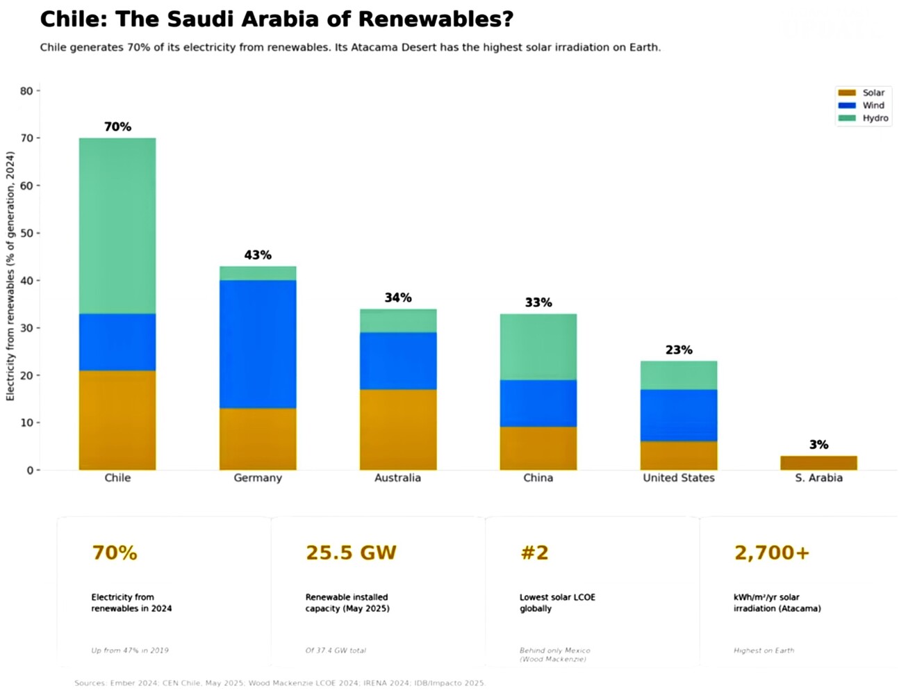 Alcuni paesi che invece restano lontani dai focolai geopolitici e offrono energia pulita abbondante ne trarranno beneficio anche per l’industria: ad esempio il Cile (e forse altri paesi del Sud America) è stato citato come la possibile Arabia delle energie rinnovabili grazie al potenziale solare, eolico e geotermico. L’Australia potrebbe fare lo stesso. Sempre che riusciranno a mantenere stabilità politica e consenso sociale.