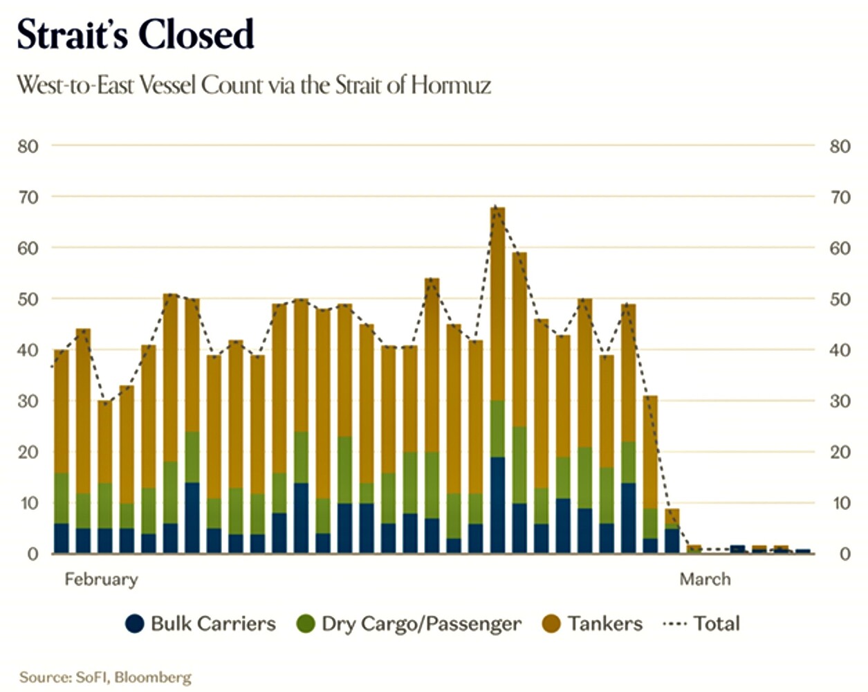 Dallo Stretto di Hormuz in precedenza passava il : 34% del petrolio mondiale 22% dei minerali 16% dei fertilizzanti. Secondo il Financial Times, se anche lo stretto tornasse ad essere aperto, il prezzo del petrolio non scenderebbe a meno di 70-80$ (almeno fino a quando non fosse ripristinata tutta la capacità produttiva oggi danneggiata ) mentre se restasse bloccato oltre un mese (e siamo alla terza settimana), il petrolio potrebbe tranquillamente superare i 100 $ al barile (di greggio), se invece restasse bloccato oltre i tre mesi facilmente supererebbe i 150.